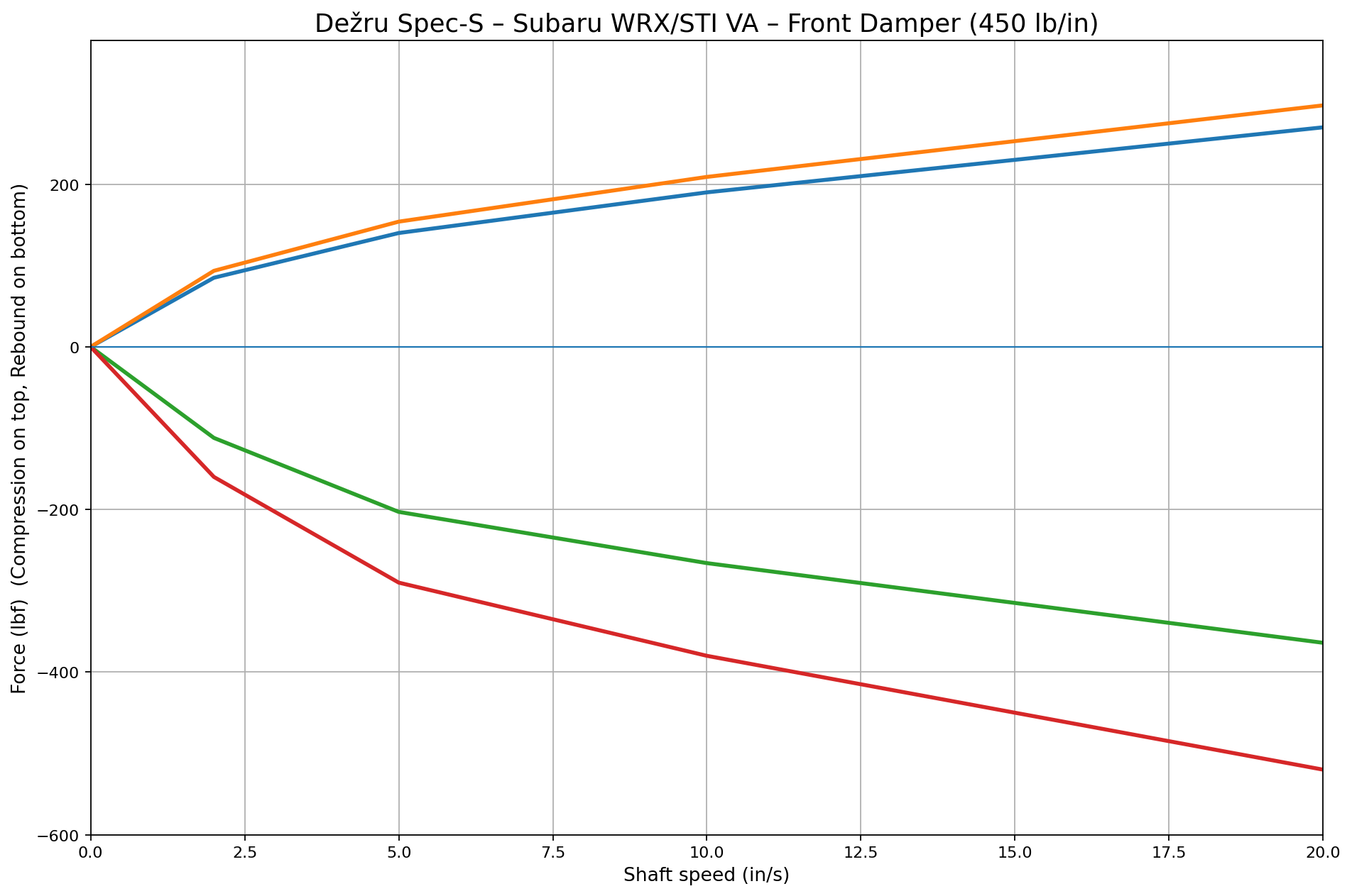 Developed for drivers who daily their WRX or STI but still enjoy spirited street driving, back roads, autocross, and occasional HPDE track days, the Spec-S features digressive piston valving that provides strong low-speed chassis support during braking, turn-in, and transitions, while remaining compliant over rough pavement, expansion joints, and uneven surfaces. Rather than relying on excessive stiffness, this setup targets a balanced ride frequency in the ~1.9–2.2 Hz range, improving control and feedback while keeping the car comfortable on real roads.