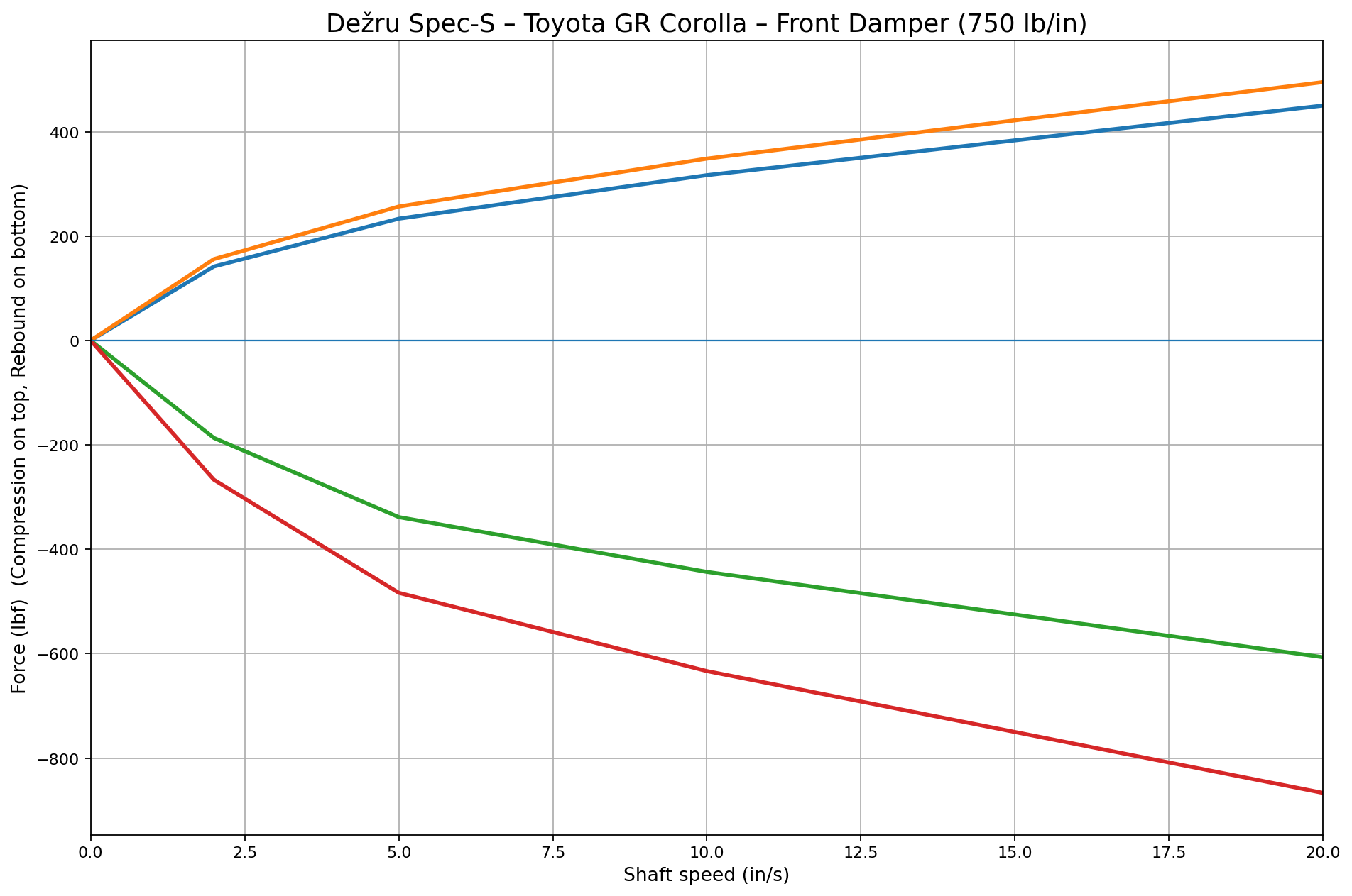 Developed for drivers who daily their GR Corolla but still enjoy spirited street driving, canyon roads, and occasional HPDE track days, the Spec-S features digressive piston valving that provides strong low-speed support during braking, turn-in, and rapid transitions, while remaining compliant over rough pavement, expansion joints, and uneven surfaces. Rather than chasing excessive stiffness, this setup targets a balanced ride frequency in the ~2.1–2.4 Hz range, sharpening response while keeping the car composed and livable on real roads.