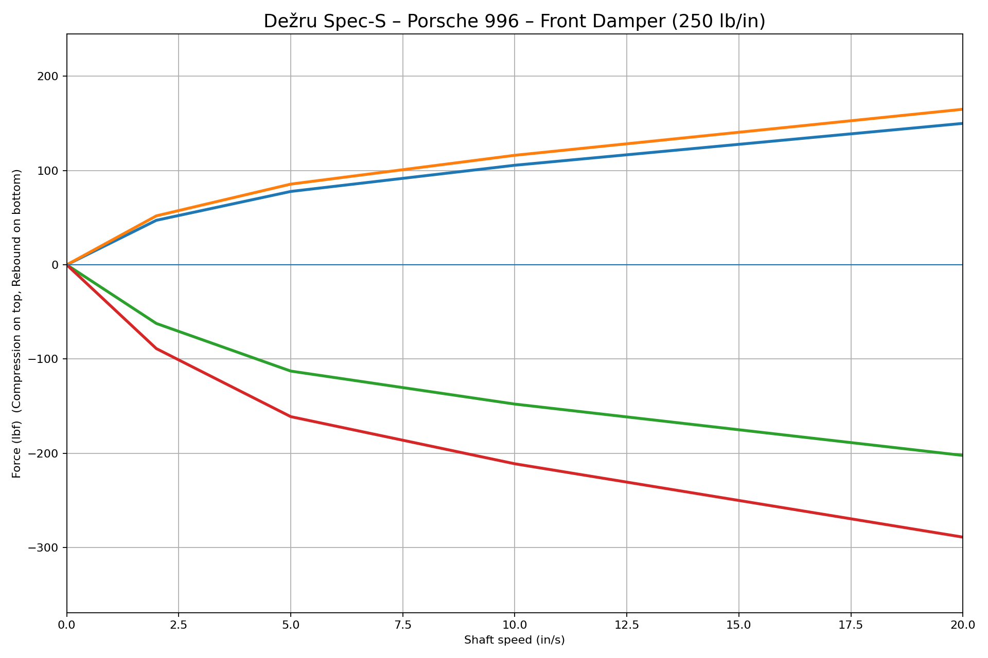 Developed for drivers who daily their 996 but still enjoy spirited street driving, mountain roads, and occasional HPDE track days, the Spec-S features digressive piston valving that provides strong low-speed chassis support during braking, turn-in, and transitions, while remaining compliant over rough pavement and surface imperfections. Rather than chasing stiffness, this setup targets a balanced ride frequency in the ~1.9–2.2 Hz range, preserving the classic 911 feel while significantly improving control.