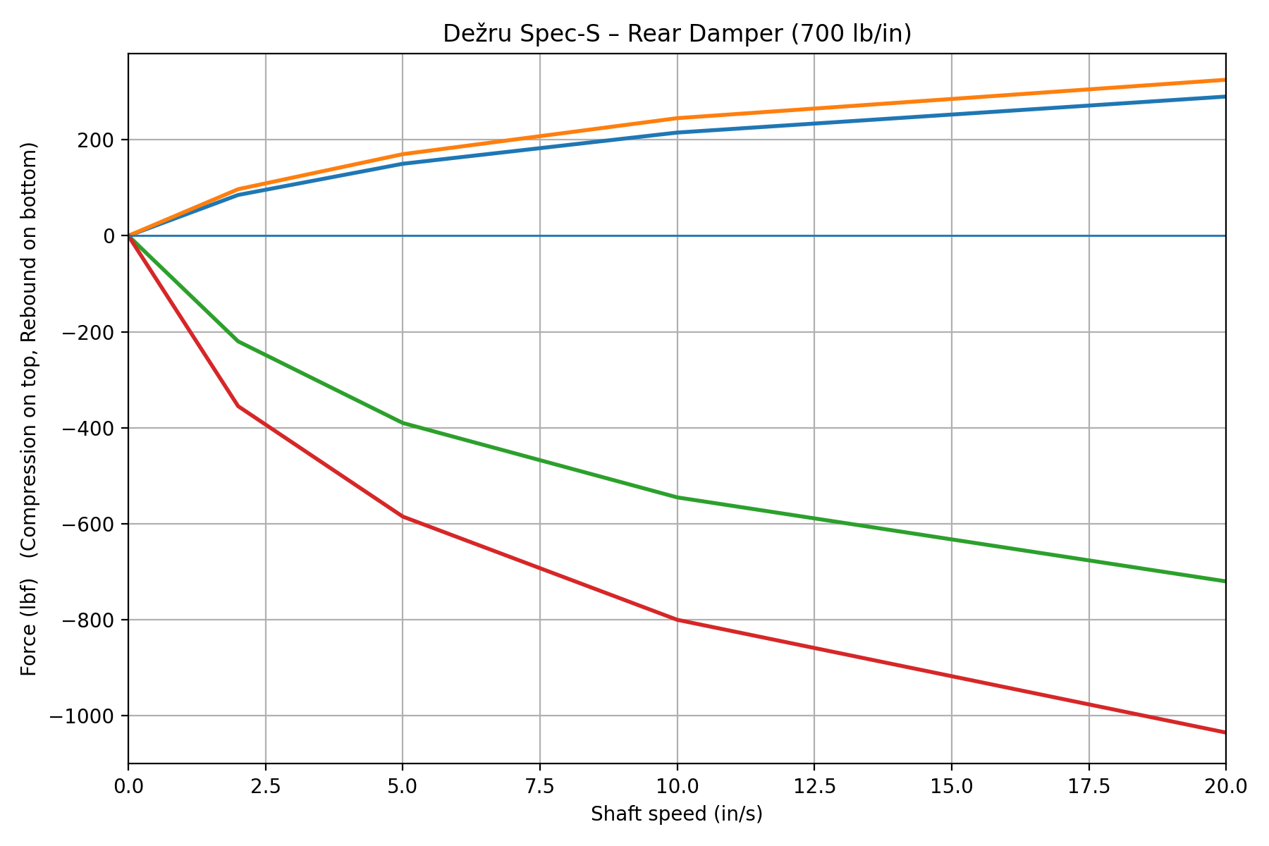 450 lb/in front and 700 lb/in rear spring rates, selected to balance front-end control with rear stability for a true street and track blend.