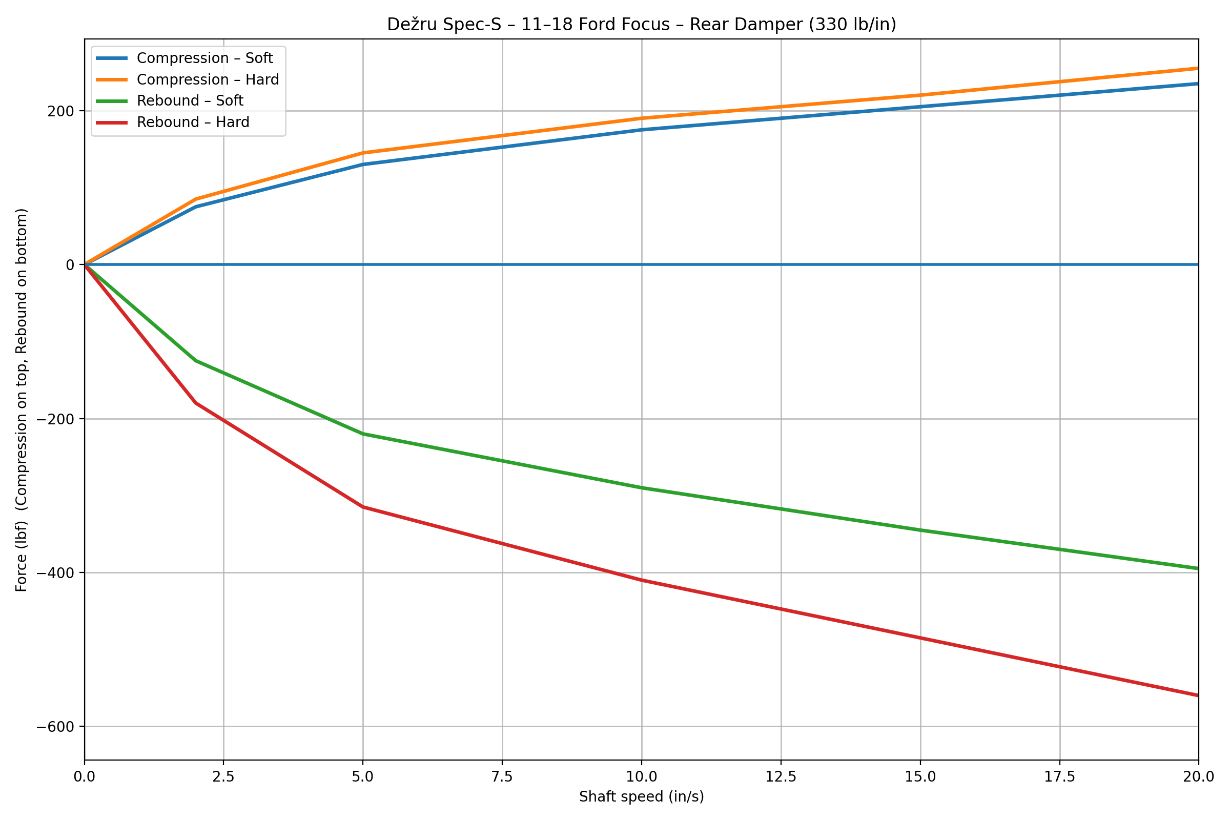 Built for drivers who use their Focus as a daily but still enjoy spirited driving, back-road runs, and occasional track days, the Spec-S uses digressive piston valving to provide strong low-speed support during braking, turn-in, and transitions, while remaining compliant over rough pavement and expansion joints. Instead of chasing excessive stiffness, the system targets a balanced ride frequency in the ~1.9–2.1 Hz range, resulting in a controlled yet livable ride.